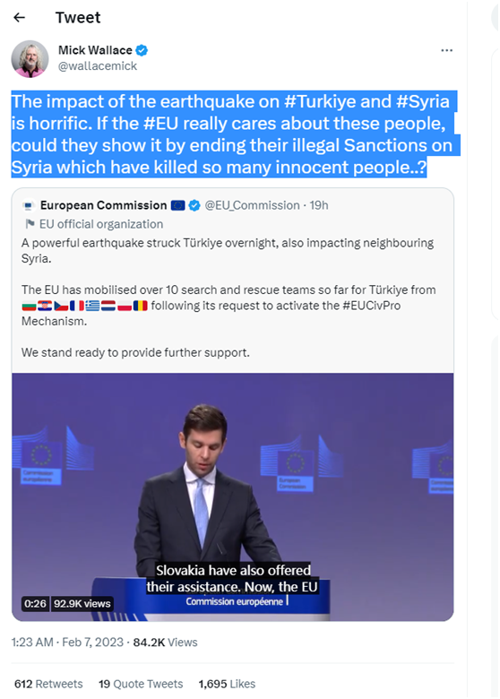 歐洲議會(huì)議員米克·華萊士在社交媒體推特發(fā)文說:“地震對(duì)土耳其和敘利亞的影響是可怕的。如果歐盟真的關(guān)心這些人,他們能通過結(jié)束對(duì)敘利亞的非法制裁來表明這一點(diǎn)嗎?”