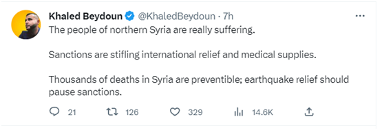 美國(guó)韋恩州立大學(xué)法學(xué)教授哈立德·貝杜恩在推特上說:“敘利亞北部的人民真的很痛苦。制裁扼殺了國(guó)際救援和醫(yī)療物資。敘利亞數(shù)千人的死亡是可以預(yù)防的;抗震救災(zāi)應(yīng)暫停制裁。”