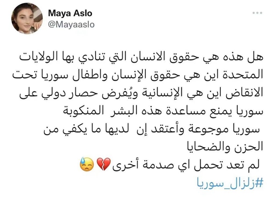 網(wǎng)友哈迪·納斯魯拉評(píng)論道:“西方必須解除對(duì)敘利亞的瘋狂制裁,并停止出于政治目的對(duì)敘利亞人民的壓制……對(duì)敘利亞的制裁導(dǎo)致醫(yī)療設(shè)備、物資甚至勞動(dòng)力短缺。敘利亞無法承受更多人面臨無家可歸的困境。敘利亞人幾乎無法取暖,因?yàn)樗麄兊氖彤a(chǎn)區(qū)被美國(guó)占領(lǐng)……”