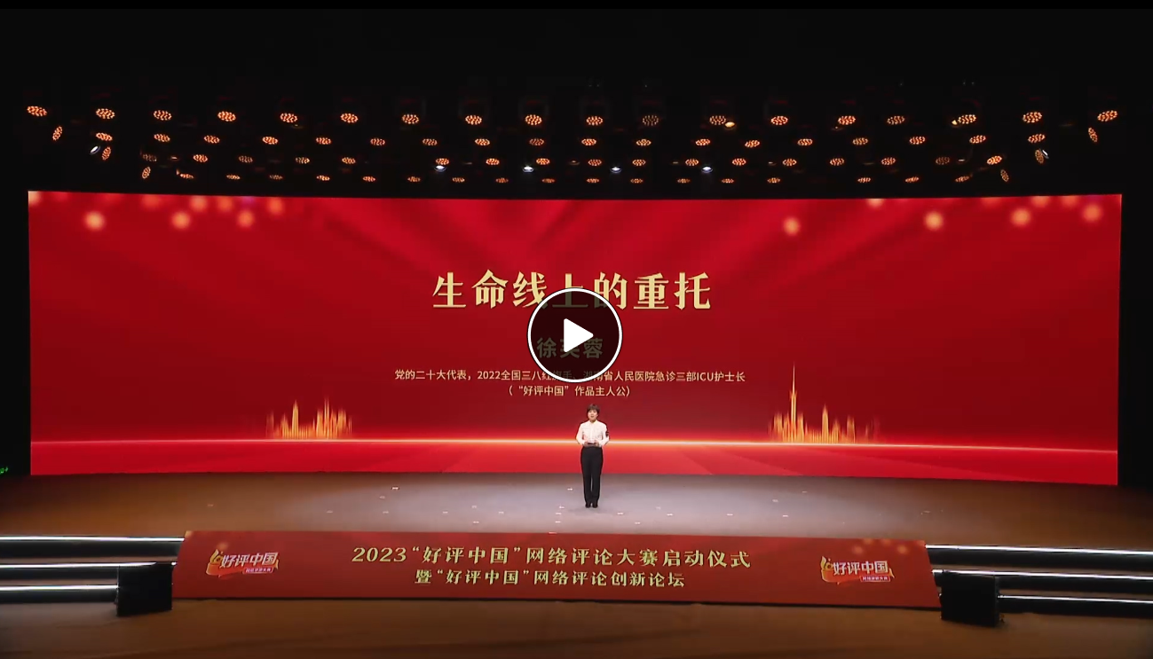 3月31日,2023“好評中國”網(wǎng)絡(luò)評論大賽啟動儀式暨“好評中國”網(wǎng)絡(luò)評論創(chuàng)新論壇在湖南長沙舉行;顒蝇F(xiàn)場,黨的二十大代表,湖南省人民醫(yī)院急診三部ICU護(hù)士長,“好評中國”參賽作品主人公徐芙蓉圍繞《生命線上的重托》作主題分享。