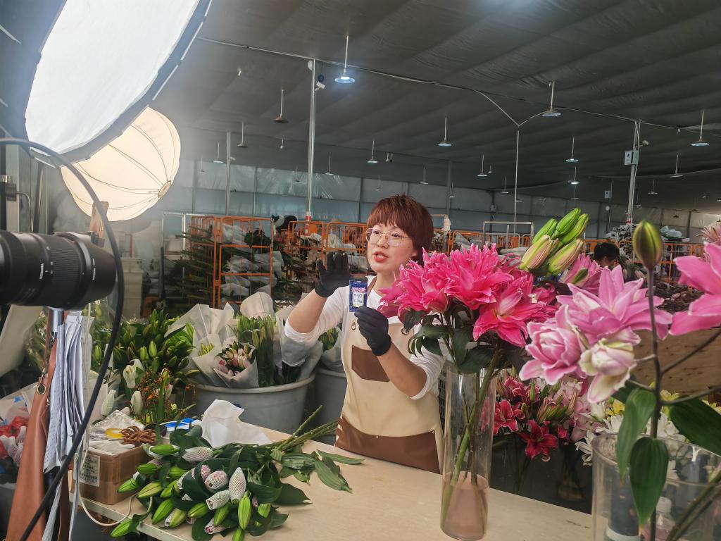 在昆明國際花卉拍賣交易中心附近,近年來新建了許多鮮花直播間,主播每天在各電商平臺直播售賣鮮花。記者在昆明夢境供應鏈有限公司的直播基地看到,多個直播間正在售賣玫瑰、百合花等。