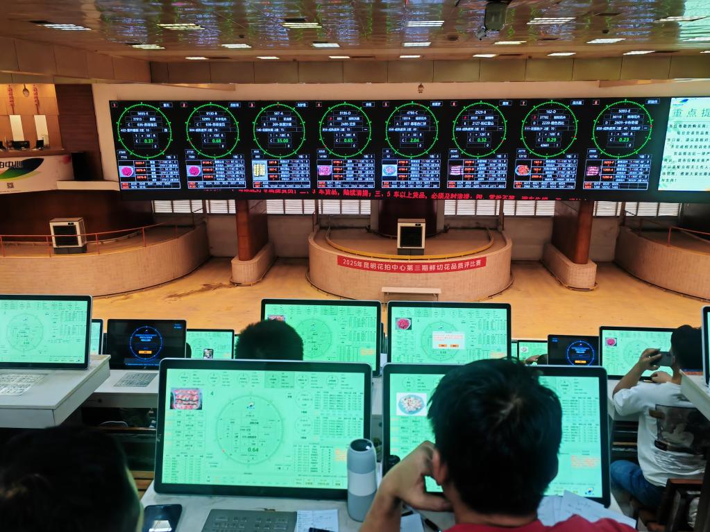 記者在昆明國際花卉拍賣交易中心看到,拍賣大鐘界面顯示著各種花卉的信息,數(shù)百名購買商操作著競價器選購鮮花。昆明國際花卉拍賣交易中心副總經(jīng)理汪洋介紹,這里每天的鮮花交易量都超700萬枝,單日最高交易量超1100萬枝,30%以上的鮮花被各大電商和直播團隊拍下,他們再拿到電商平臺或直播間銷售。