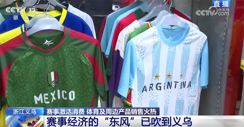 記者現(xiàn)在在義烏國(guó)際商貿(mào)城三區(qū)的體育用品專區(qū),這家商戶主營(yíng)的是足球球迷服,大家還記得四年前的卡塔爾世界杯嗎?當(dāng)時(shí)這家店的老板通過(guò)觀察各個(gè)參賽隊(duì)球迷服的訂單走勢(shì),特別是賽前那一波波的追單情況,成功預(yù)測(cè)了阿根廷隊(duì)會(huì)奪冠!您看,體育經(jīng)濟(jì)和義烏市場(chǎng)之間就這樣有了一次特別巧妙的聯(lián)動(dòng)。