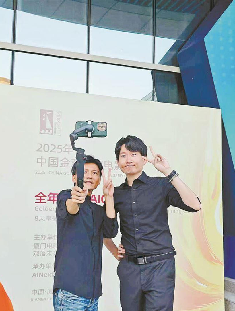 臺(tái)胞江國(guó)銘(左)與大陸青年搭檔陳鐸一起參加 2025年中國(guó)金雞百花電影節(jié)活動(dòng)。(受訪者 供圖)