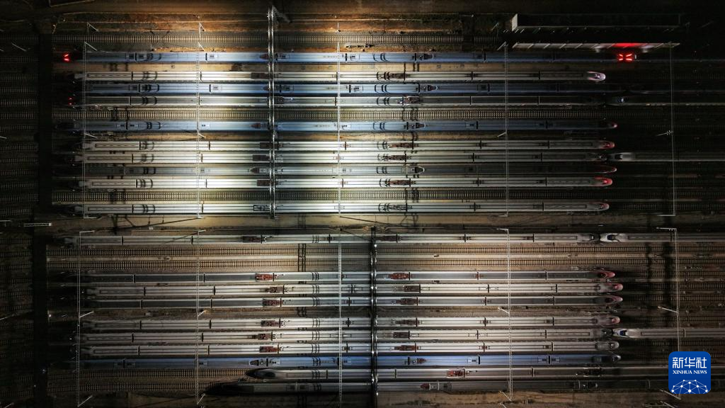 這是1月25日凌晨在昆明車輛段昆明南動(dòng)車運(yùn)用所拍攝的動(dòng)車組列車(無人機(jī)照片)。