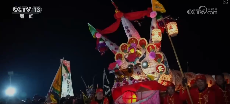 隨著天色漸晚,村里最隆重的慶;顒?xùn)|泉馬燈、張家龍燈伴隨著鑼鼓聲,依次登場。張家龍燈已有500年的歷史,現(xiàn)場近百人組成的龍燈團(tuán)隊聲勢浩大。