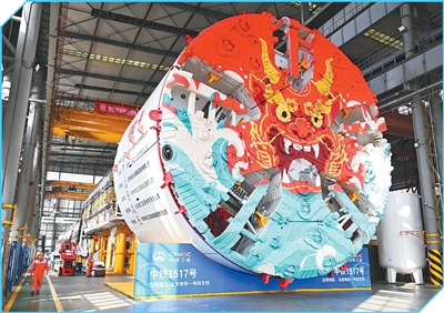 河南鄭州,中鐵裝備集團車間,工人在進行盾構(gòu)機下線驗收工作。