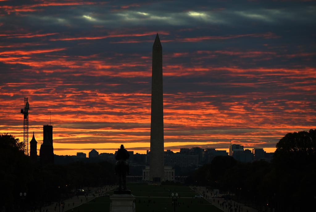 這是2025年10月15日拍攝的日落時分的美國華盛頓紀(jì)念碑。新華社記者李睿攝
