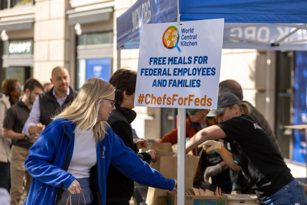 2025年11月5日,在美國首都華盛頓,聯(lián)邦雇員排隊領(lǐng)取免費食物。新華社記者胡友松攝