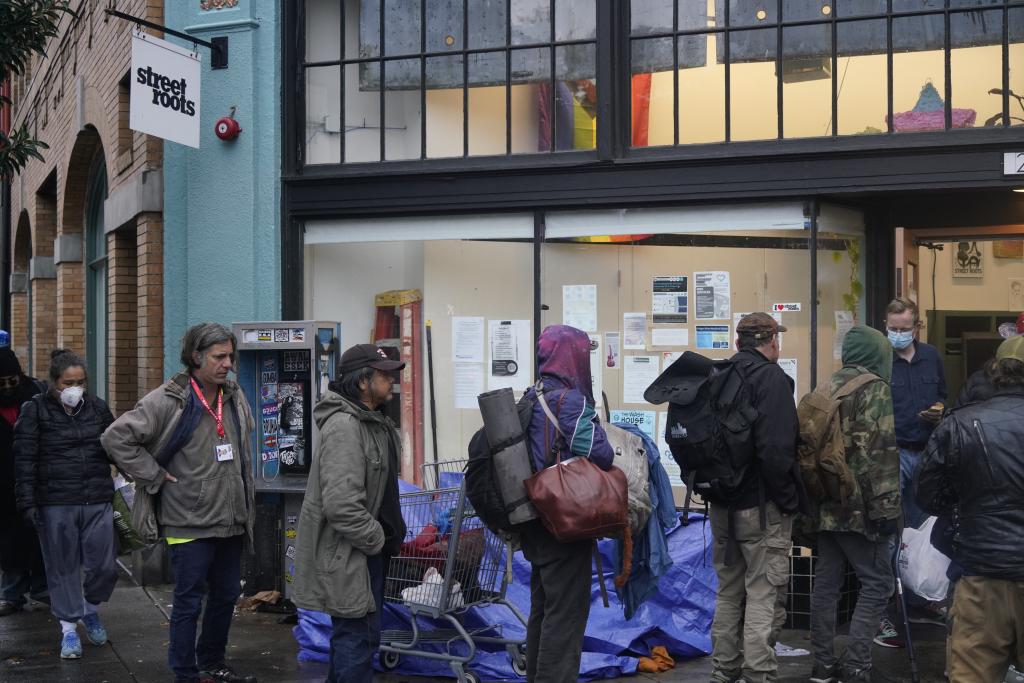 2025年11月5日清晨,在美國俄勒岡州波特蘭的深秋寒意中,無家可歸者排隊等待從民間組織領(lǐng)取救助物品。新華社記者吳曉凌攝