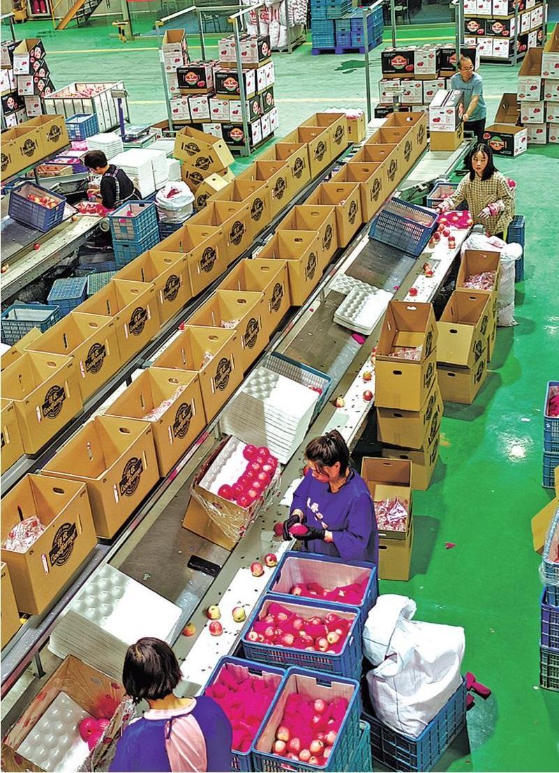 白水縣盛隆果業(yè)有限責(zé)任公司的工廠里,工人在包裝蘋(píng)果(資料照片)。