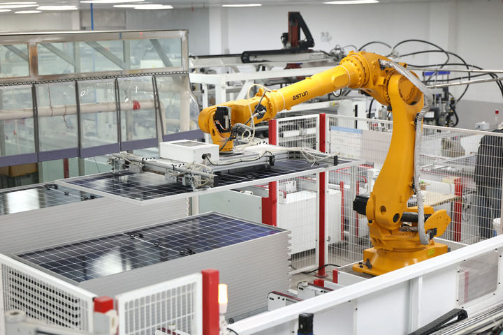 在江蘇省淮安市洪澤區(qū)新源太陽能科技有限公司生產(chǎn)車間內(nèi),工業(yè)機器人在生產(chǎn)太陽能光伏組件(2025年12月17日攝)。新華社發(fā)(殷潮 攝)