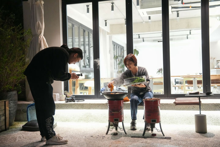 浙江省寧波市奉化區(qū)溪口鎮(zhèn)東山村民宿主董鳳潔(右)在民宿內(nèi)拍攝炒年糕的短視頻(2025年11月13日攝)。新華社記者 黃宗治 攝