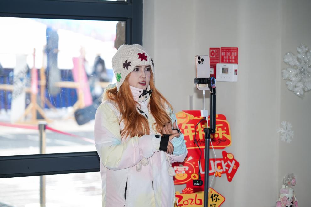 1月25日,主播在新疆那拉提哈茵賽滑雪度假區(qū)直播。近年來,依托得天獨厚的自然稟賦,新疆那拉提景區(qū)開發(fā)冰雪資源,完善冬季旅游設施,打造集滑雪、休閑等于一體的冰雪旅游目的地,將“冷資源”轉化為推動旅游高質量發(fā)展的“熱動力”。 新華社記者 徐宏巖 攝