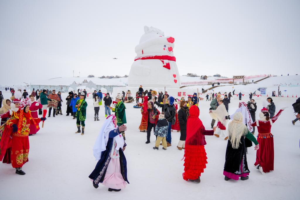 2026年1月1日,在新疆昭蘇縣濕地公園,演員與游客共同跳舞。新華社記者 徐宏巖 攝