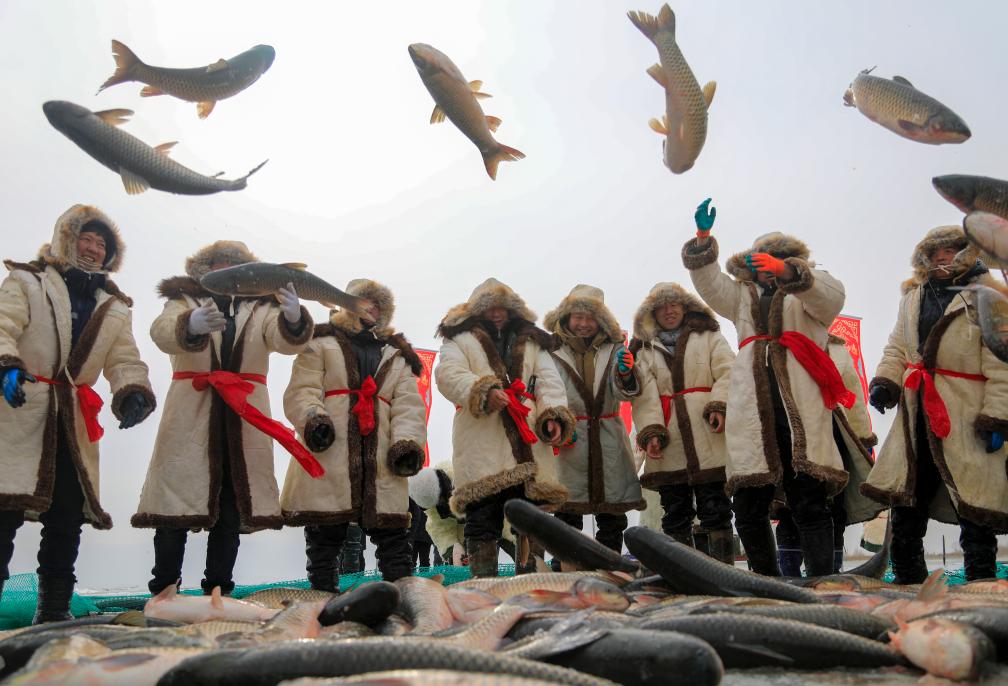 1月18日,漁民在博湖縣博斯騰湖冰面上進行冬捕作業(yè)。這次巨網(wǎng)冬捕活動,吸引各地游客前來觀賞。 新華社發(fā)(年磊攝)