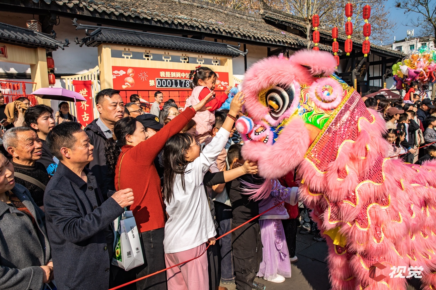 2月21日,南充市閬中古城,游客們與“醒獅”互動(dòng)。