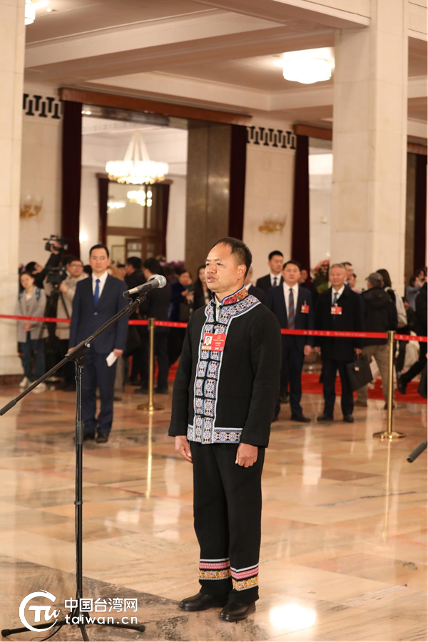 3月5日,十四屆全國人大四次會議首場“代表通道”集中采訪活動在人民大會堂舉行。這是全國人大代表農(nóng)加貴接受媒體采訪。(中國臺灣網(wǎng)記者 李寧 攝)