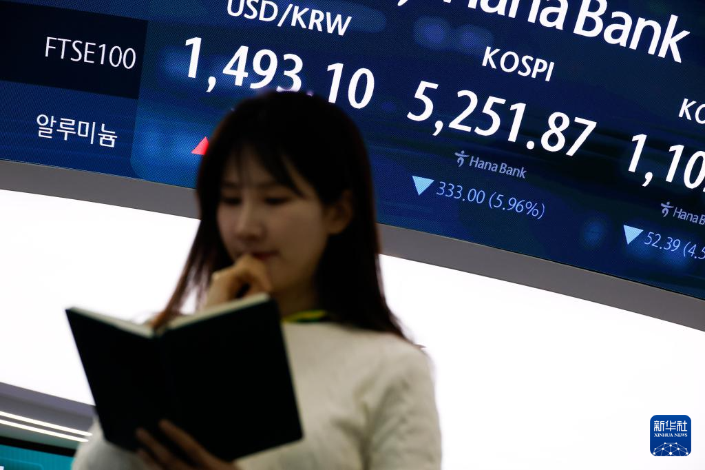 這是3月9日在韓國首爾一家銀行拍攝的股指顯示屏。