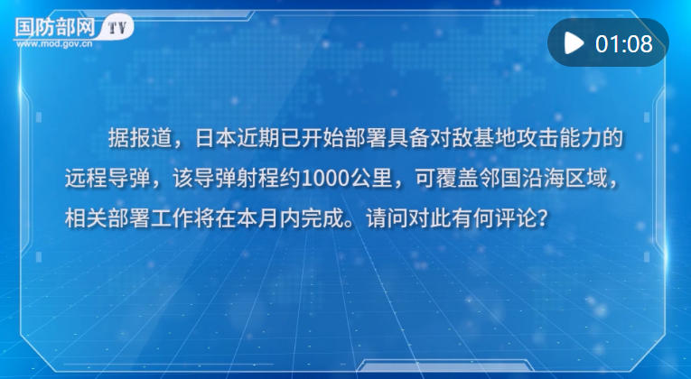 記者:據(jù)報(bào)道,日本近期已開始部署具備對(duì)敵基地攻擊能力的遠(yuǎn)程導(dǎo)彈,該導(dǎo)彈射程約1000公里,可覆蓋鄰國(guó)沿海區(qū)域,相關(guān)部署工作將在本月內(nèi)完成。請(qǐng)問(wèn)對(duì)此有何評(píng)論?
