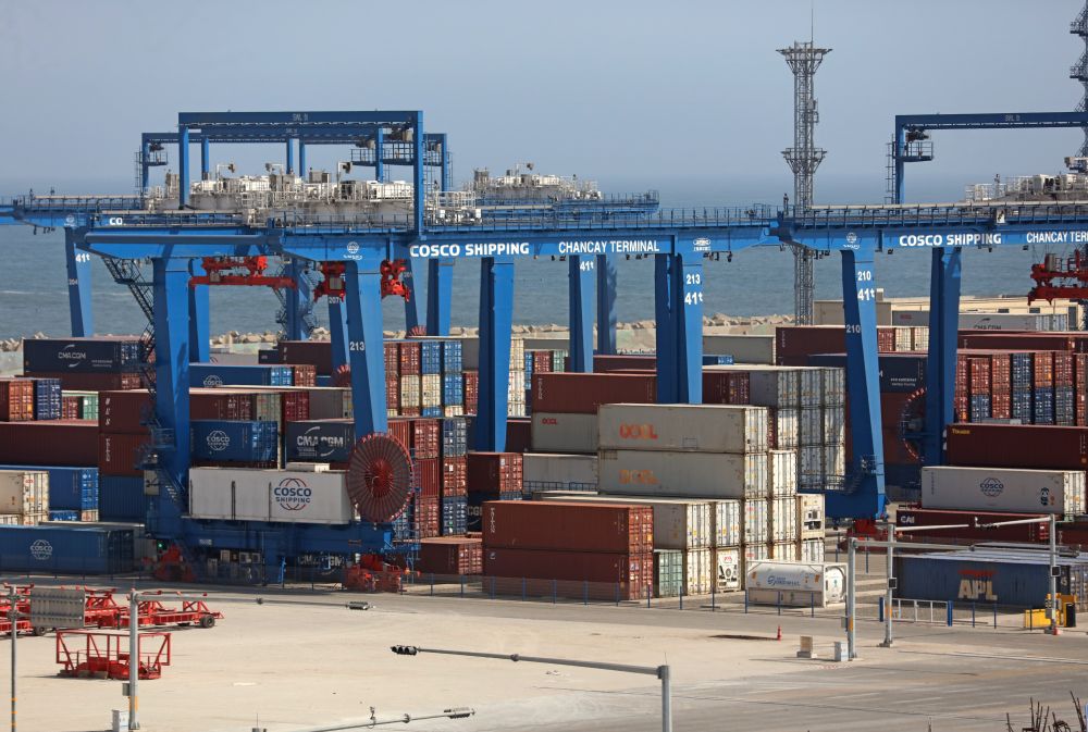 這是2025年10月7日拍攝的秘魯錢凱港碼頭擺放的集裝箱。位于秘魯首都利馬以北約80公里的錢凱港于2024年11月正式開港,標志著中秘共建“一帶一路”取得新的重要成果。新華社發(fā)(瑪麗安娜·巴索攝)