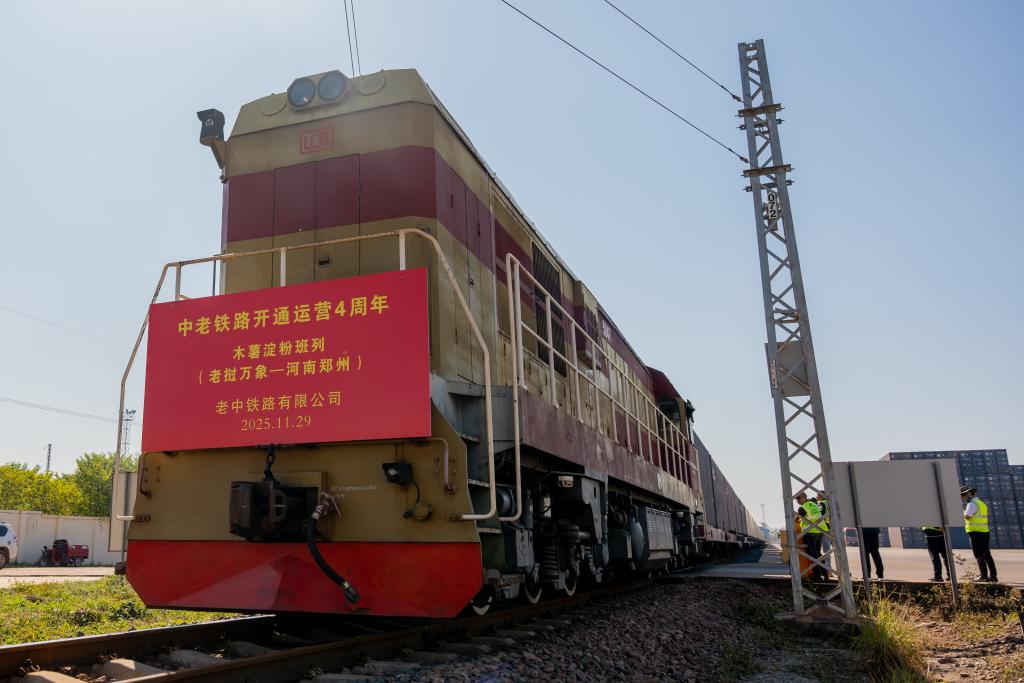 2025年11月29日,在老撾首都萬象中老鐵路萬象南站,一列滿載1000噸木薯淀粉的鐵路集裝箱班列準備出發(fā),前往中國城市鄭州。新華社發(fā)(凱喬攝)