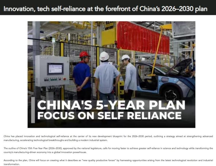 文章認(rèn)為,中國已將創(chuàng)新和科技自立自強置于“十五五”規(guī)劃新發(fā)展藍(lán)圖的核心位置。該藍(lán)圖闡述了一系列旨在強化高端制造業(yè)、加速技術(shù)突破以及構(gòu)建現(xiàn)代化產(chǎn)業(yè)體系的戰(zhàn)略方針。根據(jù)該規(guī)劃,中國將聚焦于通過把握最新技術(shù)革命和產(chǎn)業(yè)變革所帶來的機遇,發(fā)展新質(zhì)生產(chǎn)力。