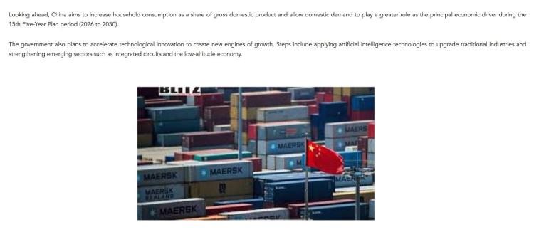 文章注意到,中國計劃在“十五五”期間提高居民消費占國內(nèi)生產(chǎn)總值的比重,讓內(nèi)需在拉動經(jīng)濟增長中發(fā)揮更主要的作用。此外,政府還計劃通過加快科技創(chuàng)新打造經(jīng)濟增長新引擎,具體措施包括應(yīng)用人工智能技術(shù)賦能傳統(tǒng)產(chǎn)業(yè)轉(zhuǎn)型升級,以及做大做強集成電路、低空經(jīng)濟等新興產(chǎn)業(yè)。