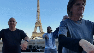 國際太極拳日前夕,太極愛好者在法國巴黎埃菲爾鐵塔下習(xí)練太極拳。