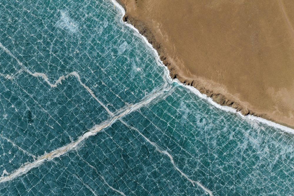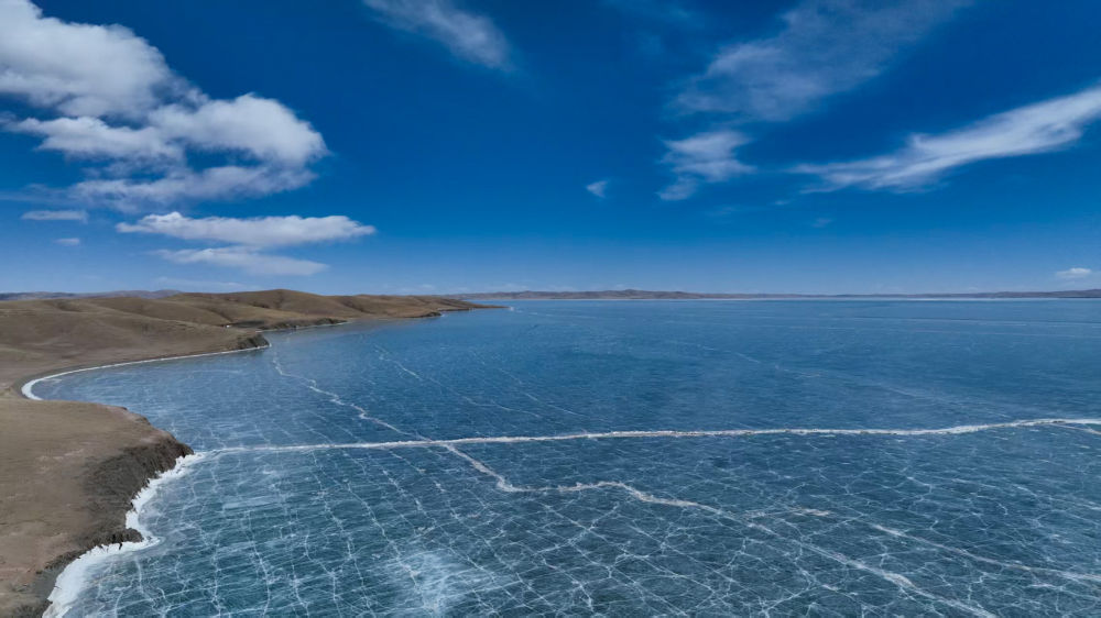 這是3月10日在青海省果洛藏族自治州瑪多縣境內(nèi)拍攝的扎陵湖一角(無(wú)人機(jī)照片)。新華社記者 張龍 攝