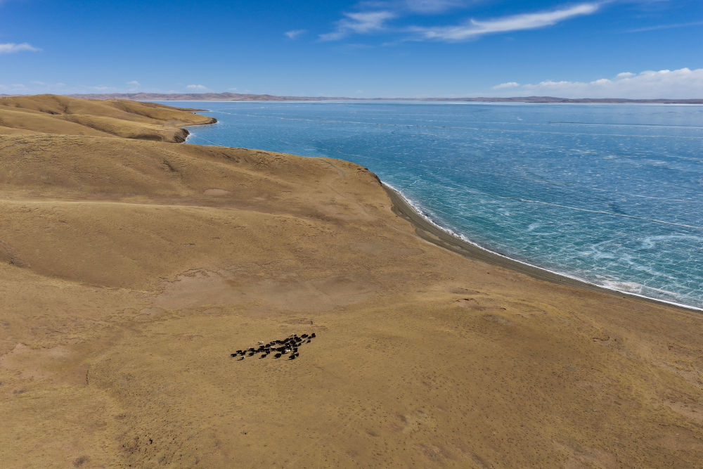 3月10日,一群牦牛在青海省果洛藏族自治州瑪多縣境內(nèi)的扎陵湖邊覓食(無(wú)人機(jī)照片)。新華社記者 張龍 攝