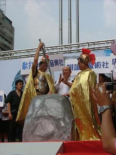 中國(guó)臺(tái)灣網(wǎng)8月1日消息 據(jù)臺(tái)媒報(bào)道,中國(guó)國(guó)民黨青年團(tuán)在上個(gè)星期正式選出臺(tái)灣世新大學(xué)研究生黃執(zhí)中,擔(dān)任新任總團(tuán)長(zhǎng),今天下午舉行交接典禮。在國(guó)民黨主席吳伯雄的見證下,打扮成武士的原任總團(tuán)長(zhǎng)林益世正式把總團(tuán)長(zhǎng)職務(wù)交給新任總團(tuán)長(zhǎng)黃執(zhí)中。