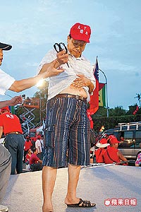 去年焚車嗆扁的蔡芳樹,昨天剪刀刺肚皮,抗議陳水扁害人民生活困苦。(圖:臺灣《蘋果日報》)