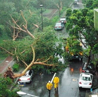臺北市東華街、西安街的捷運沿線許多路樹倒塌,多輛汽機車遭壓頂。