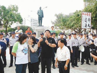 “臺(tái)獨(dú)”團(tuán)體“908臺(tái)灣國(guó)運(yùn)動(dòng)”南區(qū)辦公室人員欲拆除嘉義市中正公園的蔣介石銅像,民進(jìn)黨籍嘉義市議員蔡文旭(拿麥克風(fēng)者)說(shuō),拆除意志如奇萊山般堅(jiān)定。《聯(lián)合報(bào)》記者郭勝恩攝