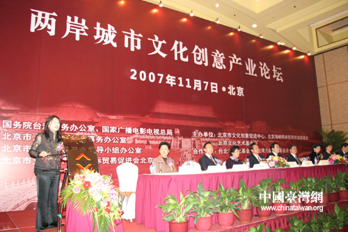 “兩岸城市文化創(chuàng)意產(chǎn)業(yè)論壇”是2007年兩岸城市文化創(chuàng)意產(chǎn)業(yè)交流互訪系列活動之一。旨在促進兩岸文化創(chuàng)意產(chǎn)業(yè)策略、方法與務(wù)實經(jīng)驗等方面交流,積極搭建兩岸文化創(chuàng)意產(chǎn)業(yè)交流平臺。此次有200余名來自京臺兩地的文化創(chuàng)意、影視產(chǎn)業(yè)界人士相聚北京,就進一步推動兩岸文化創(chuàng)意產(chǎn)業(yè)的交流與合作進行研討。(文/圖 李徽)