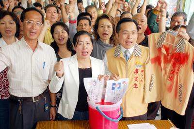 臺(tái)聯(lián)黨“立委”尹伶瑛(前排左二)與101名黨員,8日下午宣布集體退黨,抗議臺(tái)聯(lián)黨中央被“紅衫軍”占領(lǐng),高呼“臺(tái)聯(lián)紅衫軍全面掃除”等口號(hào),并將黨證丟入紅水桶。臺(tái)灣“中央社”記者葉子綱攝