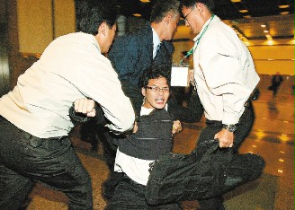 女“紅衫軍”嗆扁遭架離。(聯(lián)合報(bào)圖)