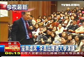 據(jù)臺TVBS電視臺報(bào)道,李昌鈺昨晚的演講現(xiàn)場座無虛席、整場爆滿。從求學(xué)經(jīng)歷講到對國際刑案的剖析,李昌鈺讓師生們聽得津津有味。