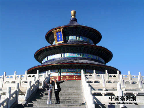 《Forever Friends》音樂電視劇組在天壇祈年殿拍攝,圖為孫楠、李玟聯(lián)袂現(xiàn)場錄制中。
