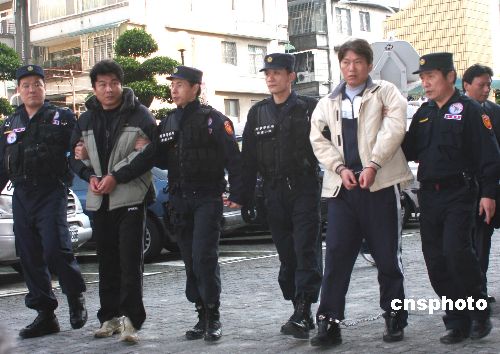 今年1月25日,臺(tái)灣運(yùn)鈔車劫案嫌犯李漢揚(yáng)(左二)、李金瓚(左五)兄弟自大陸遣返,經(jīng)馬祖被押送到臺(tái)北。(中新網(wǎng)資料圖)