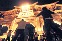 臺當局“教育部”打算拆除中正紀念堂“大中至正”牌匾。臺北市政府向臺北高等行政法院聲請假處分,要求暫緩拆除,經臺北高等行政法院審理后予以駁回。但另一方面對于拆除牌匾的現(xiàn)行犯,臺北市政府也有逮捕權力。圖為學生們聚集在“大中至正”牌匾下運動!。ㄅ_灣《中國時報》圖片)
