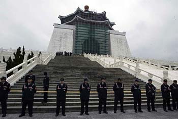 臺北市中正紀念堂“大中至正”牌匾拆除爭議,臺當局和臺北市政府動作頻頻,臺當局“教育部”等單位請保安警察攔阻臺北市政府人員拆除主堂鷹架,場面一度僵持!吨袊鴷r報》記者陳麒全攝