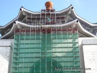 “中正紀(jì)念堂”牌匾字體今天開始拆除。(東森新聞圖)