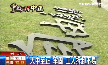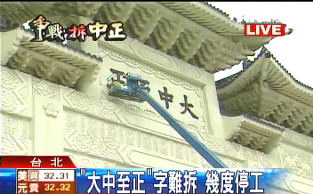 中國臺灣網(wǎng)12月7日消息 “臺灣民主紀(jì)念館”(原名中正紀(jì)念堂)拆除“大中至正”牌匾今天上午動工,拆除工作2小時并不順利,僅拆除園區(qū)內(nèi)牌匾“正”字一顆螺絲;施工人員中午采買工具后,午后繼續(xù)拆除,截止發(fā)稿時止,相關(guān)工作人員已用吊車將“中”字拉了下來。
