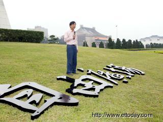 臺(tái)當(dāng)局官員站在新制作的“自由廣場(chǎng)”字型旁解釋名稱緣由。