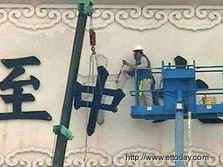 搭乘吊車的工人將“大中至正”牌匾的“中”字拆下。