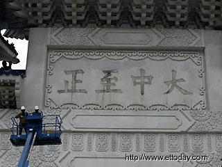 “中正紀(jì)念堂”正門牌樓上的“大中至正”順利拆下,但主館上的“中正紀(jì)念堂”牌匾,昨天工程卻完全停擺,由于臺北市聲稱未通過勞檢而勒令停工,15塊花崗巖組成的“中正紀(jì)念堂”牌匾,只在前天拆卸下4塊。