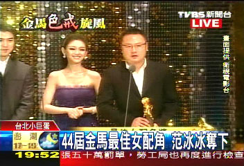 金馬獎(jiǎng)第一個(gè)獎(jiǎng)項(xiàng)是最佳女配角,角逐該獎(jiǎng)項(xiàng)的有張鈞寧、邵美琪、范冰冰、曾愷玹;最后由出演《心中有鬼》的范冰冰奪得;但因?yàn)樾谐剃P(guān)系,范冰冰無法出席,由電影公司代表領(lǐng)獎(jiǎng)。