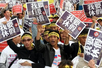臺(tái)灣移工聯(lián)盟9日在臺(tái)北市舉行“我要休假——臺(tái)灣移工大游行”,來(lái)自全臺(tái)各地的外勞一起爭(zhēng)取休假權(quán)!爸醒肷纭庇浾哙嵔芪臄z
